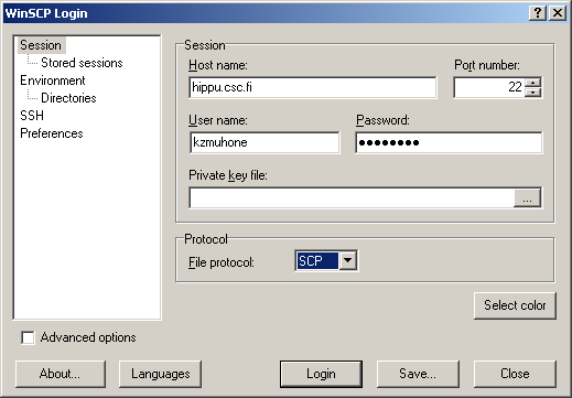 - Kun Winscp:n käynnistää, tulee esille seuraava ikkuna, johon täytetään palvelinkoneen IP-osoite, käyttäjätunnus ja salasana. Huomaa, että CSC:n laskentaympäristössä käy vain CSC:n antama käyttäjätunnus ja siihen kuuluva salasana, jotka saattavat olla erilaisia kuin oman yliopistosi käyttäjätunnus!