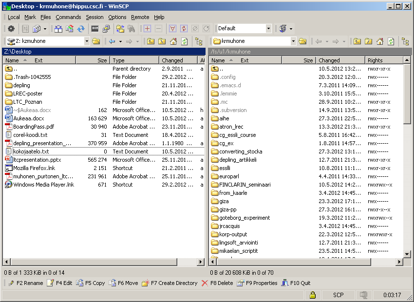 - Yhteyden synnyttyä Winscp:n pääikkuna aukeaa. Pääikkunassa voit siirtää tiedostoja puolin ja toisin (palvelimelta omalle koneelle ja päinvastoin) vaikka raahaamalla.