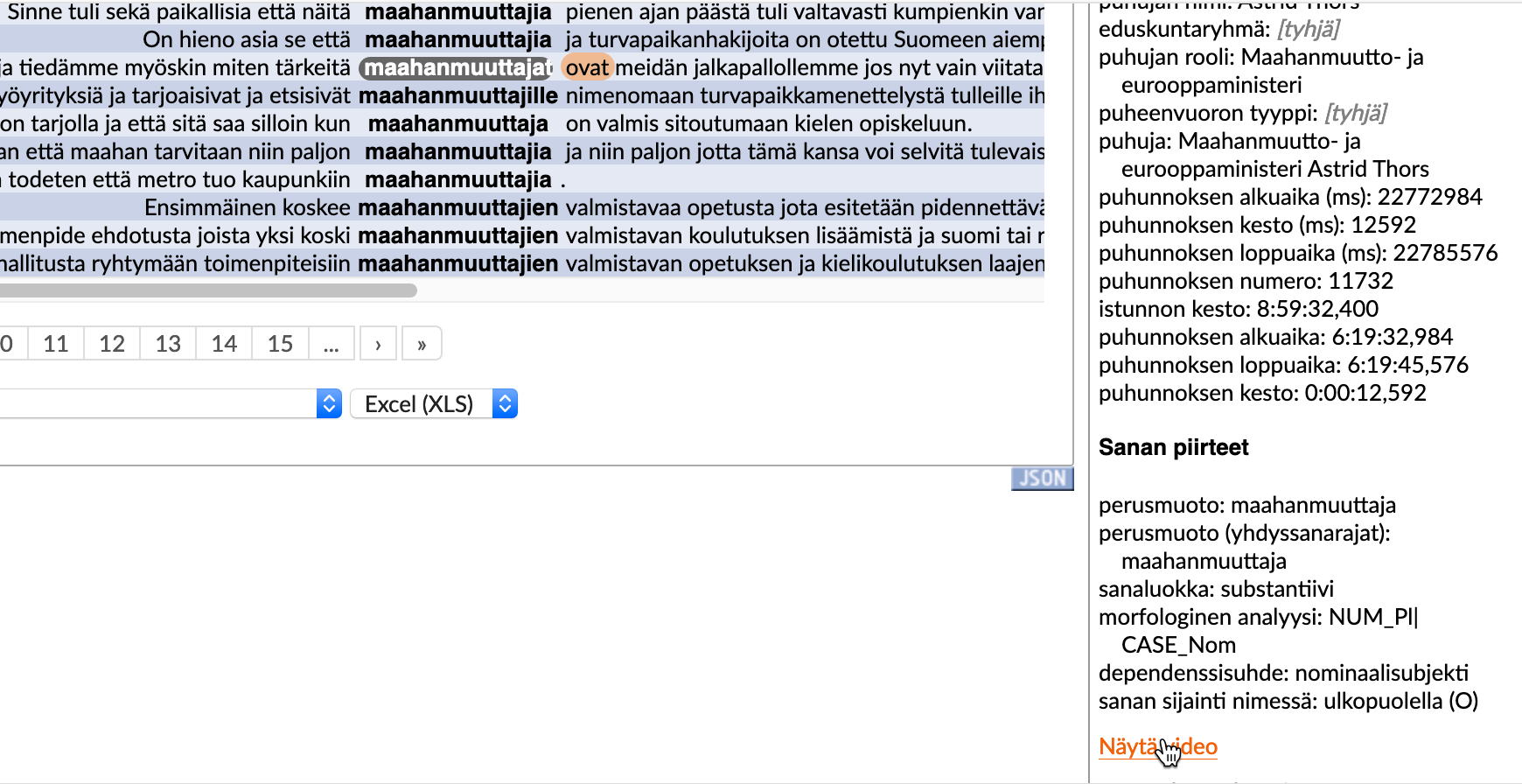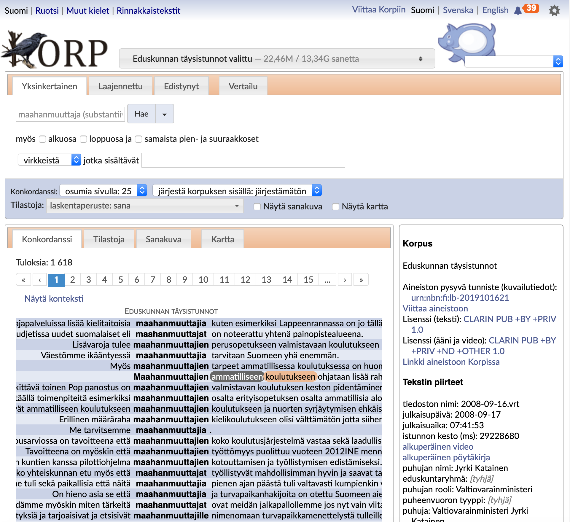 Lähes kaikista Korp-hakutuloksista on myös linkki vastaavaan kohtaan alkuperäisessä videossa (videolinkit on lisätty aineiston Korp-versioon 1.5). Lisäksi käyttäjä voi tarvittaessa ladata Korp-versiota 1.5 vastaavat VRT-muotoiset tekstitiedostot sekä keskustelujen äänitteet ja EAF-muotoiset annotaatiotiedostot aineiston ladattavasta versiosta sekä noutaa eduskunnan palvelimelta alkuperäisiä videoita.