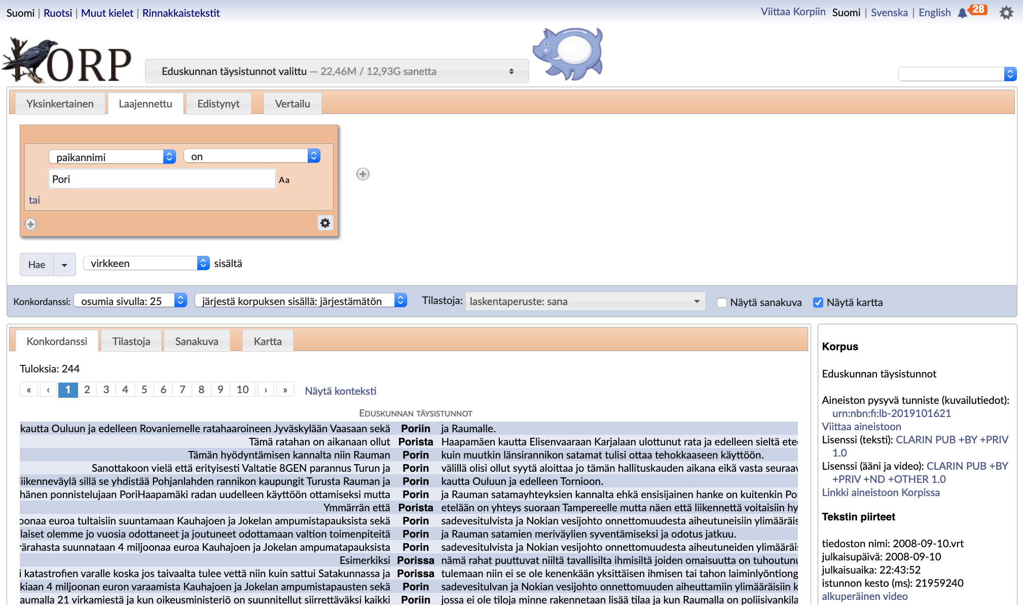 Aineistosta voi tehdä monenlaisia hakuja ja tilastoida tuloksia Kielipankin Korp-palvelussa. Eri puhujien puheenvuorot on merkitty aineistoon erikseen. Korpin laajennettu haku -välilehdellä voi rajata hakuja esimerkiksi puhujan, hänen edustamansa eduskuntaryhmän tai hänen roolinsa perusteella.
