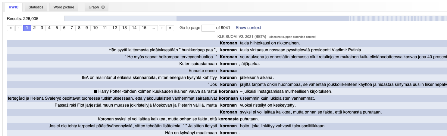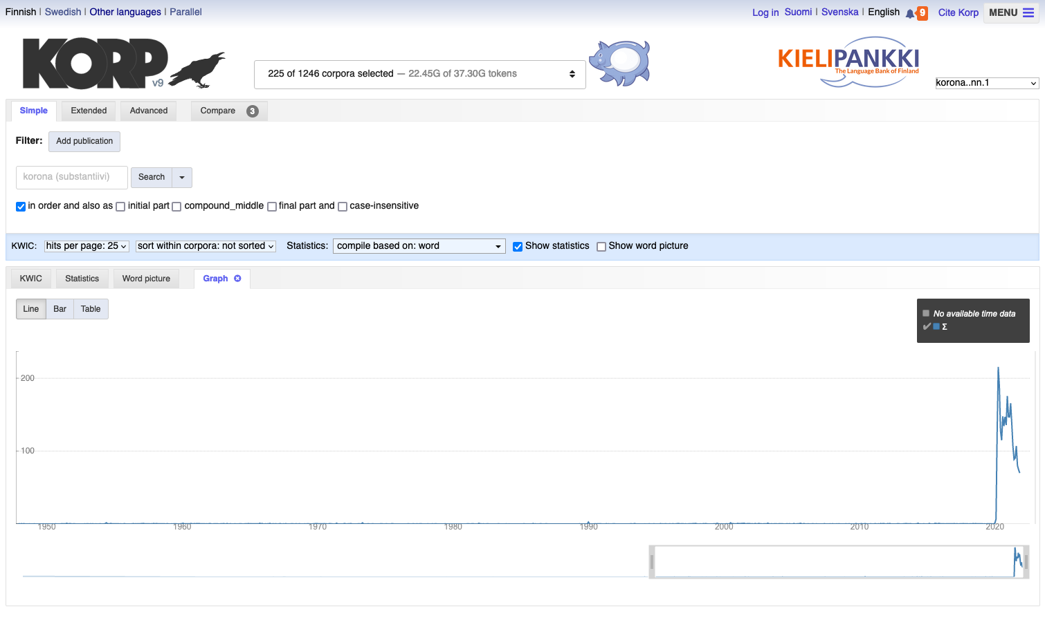 Please note that Korp searches may be slow because of the large size of the corpus, so you should at least at first try searching from a small subset of the corpus. If choosing a subset (years) of the corpus in the Korp corpus selector appears slow, you can try to restart the browser or try using a different browser.