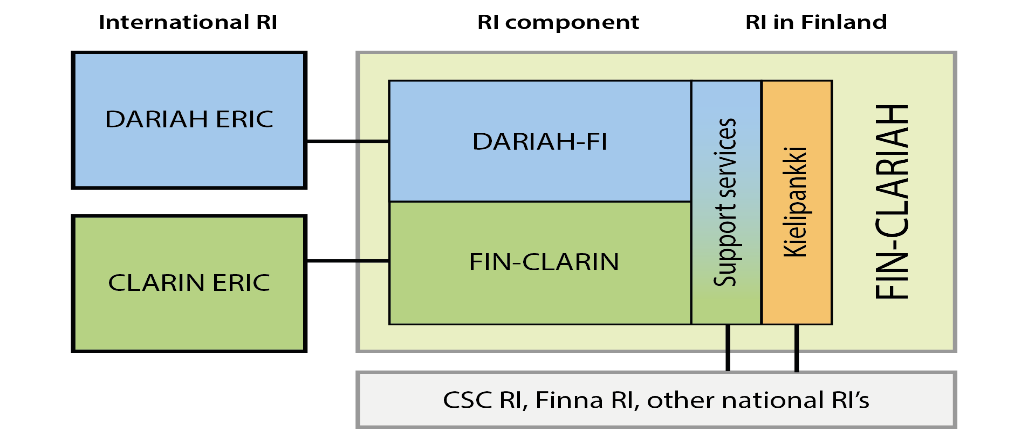 FIN-CLARIAH can be described on three levels according to Fig. 1, in which it is the common RI for its two components, which function as the national nodes of the corresponding international RIs. Of these, Finland is already a member of CLARIN ERIC. State membership in DARIAH ERIC can only be achieved by inclusion on the national roadmap. Hence, FIN-CLARIAH offers the Language Bank (Kielipankki) as a national RI service centre for the SSH field based on resources and services in cooperation with its national RI members and collaborators.