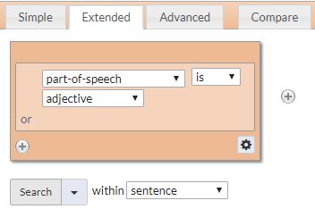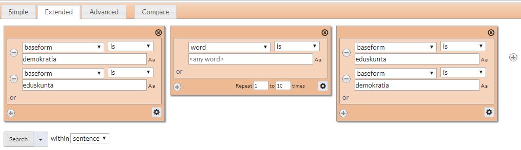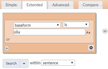 This page shows some extended search example with screenshots. It complements the section Extended Search of the main Korp documentation. Note that the extended search form has slightly changed in Korp9: The (+) sign is an explicit ”and” and the option cogwheel an explicit ”Options”.
