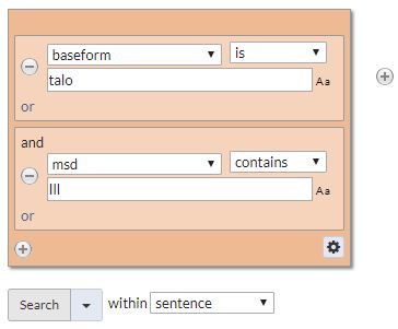 Note: The search only works properly if you use the AND operator, only then will Korp find baseforms that are ”talo” and are in illative case.