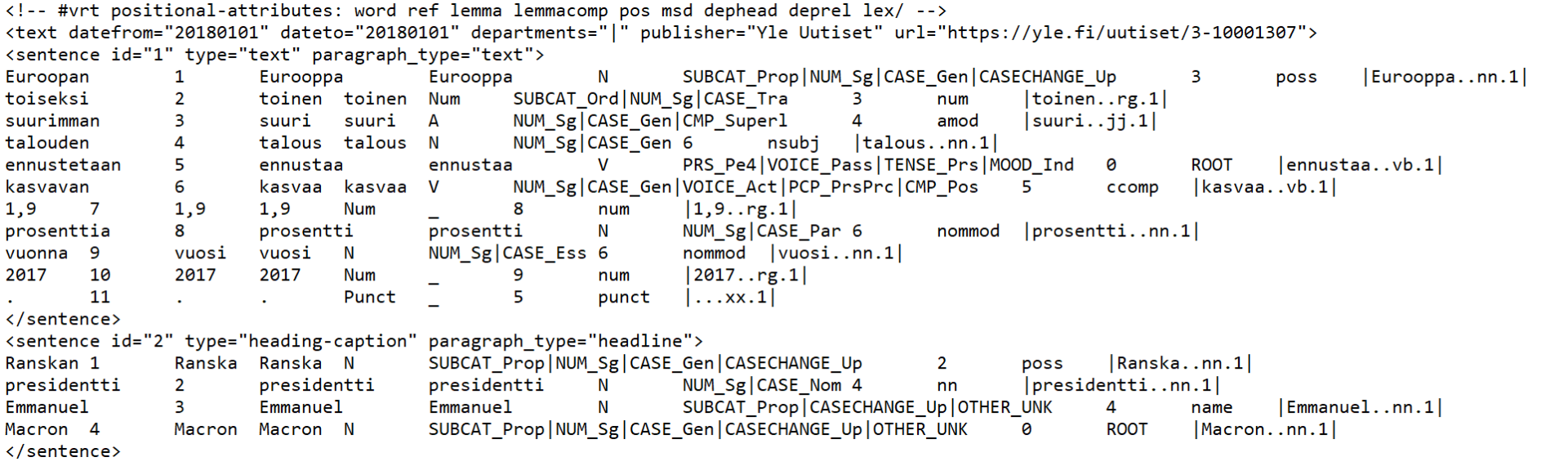 VRT (VeRticalized Text) is the input format for the IMS Open Corpus Workbench (CWB) software underlying Korp. VRT is a token-oriented columnar text format: each token (word) is on its own line together with its possible annotation attributes (positional attributes), such as lemma, part of speech, morphological analysis and syntactic relation, separated by tabs. The structure of the text is represented with XML-style tags on their own lines. Start tags may contain XML-style attributes for the structure (structural attributes), which may vary between corpora. In contrast to XML, VRT does not require a single root element (structural attribute), so a VRT input may consist of a sequence of texts, for example.