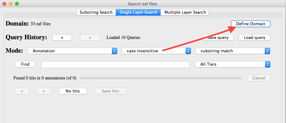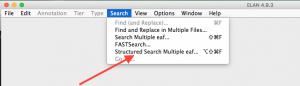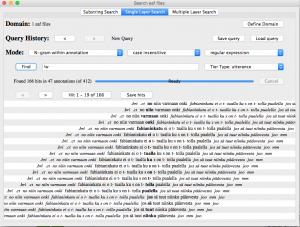 Esimerkiksi Reitti A-siipeen -korpuksen kohdalla voi valita ”Tier type: utterance”, jolloin saneet etsitään yhdellä kertaa niistä kerroksista, jotka sisältävät (kumman tahansa puhujan) puheen litteraatin.