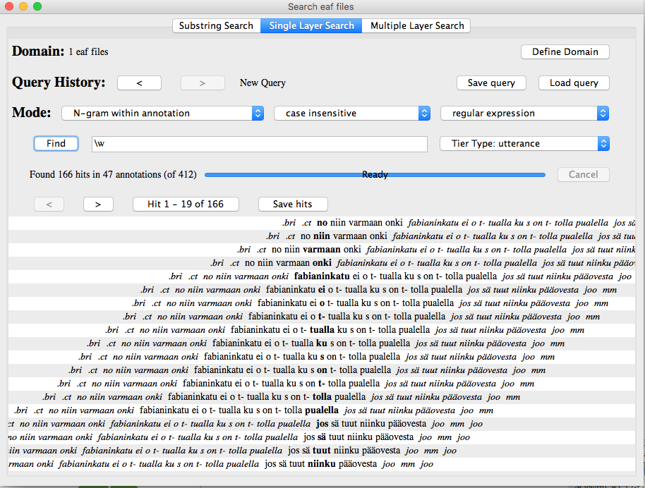 Klikkaa lopuksi Find ja odota hetki, niin kokonaissanemäärä ilmestyy tekstikentän alapuolelle, Ready-tekstin viereen. Esimerkiksi tulos 166 hits in 47 annotations tarkoittaa, että valitusta aineistosta löytyi 166 sanetta (yhteensä 47 annotoidussa puhunnoksessa tai muussa litteroidussa pätkässä). |