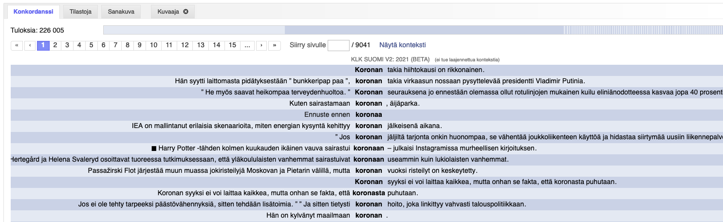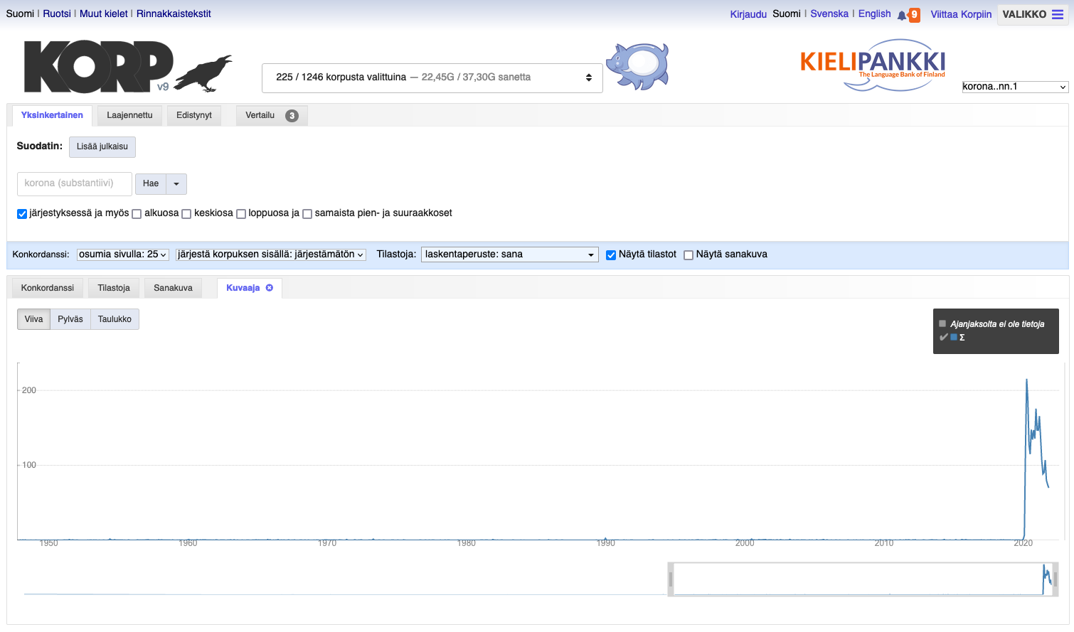 Aineiston suuren koon vuoksi Korp-haut voivat olla hitaita, joten kannattaa ainakin ensin kokeilla hakuja pienehköllä osalla aineistoa. Jos aineiston osan (vuosien) valinta Korpin aineistovalikossa vaikuttaa hitaalta, kannattaa kokeilla käynnistää selain uudelleen tai kokeilla toista selainta.