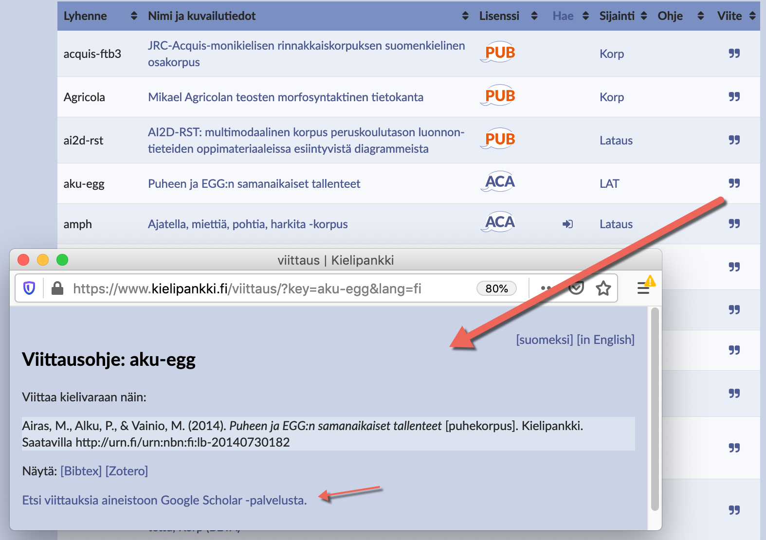 Kielipankin kautta välitettävien aineistojen jokaisella eri versiolla on oma viittausohje. Aineistokohtaiset ohjeet löytyvät Kielipankin aineistoluettelosta lainausmerkkikuvakkeiden kohdalta sekä jokaisen aineistoversion kuvailutiedoista. Viittausmuodon yhteydessä tarjotaan nyt myös Google Scholar -hakulinkki, joilla voi etsiä kyseiseen aineistoon liittyviä julkaisuja.